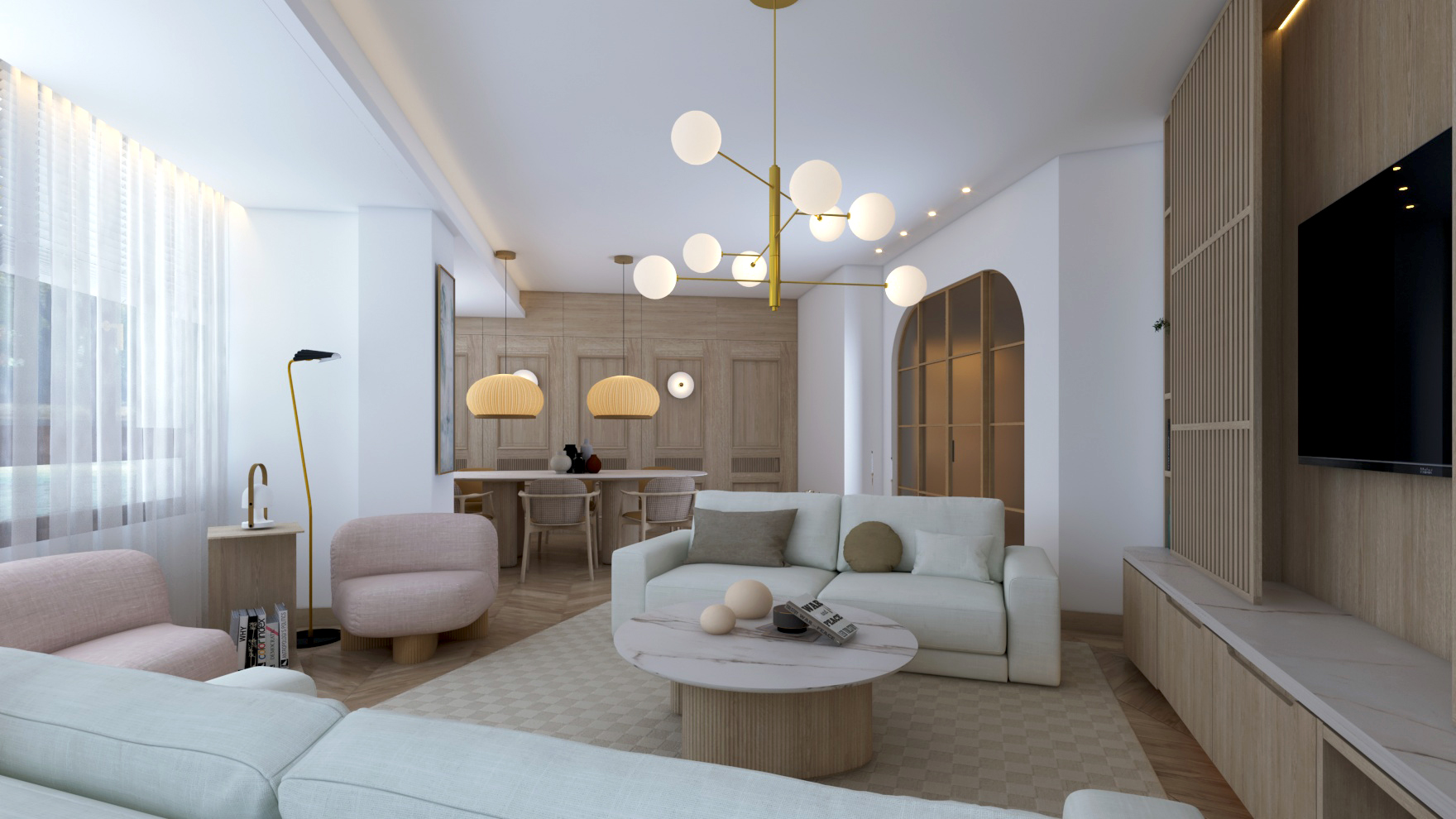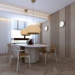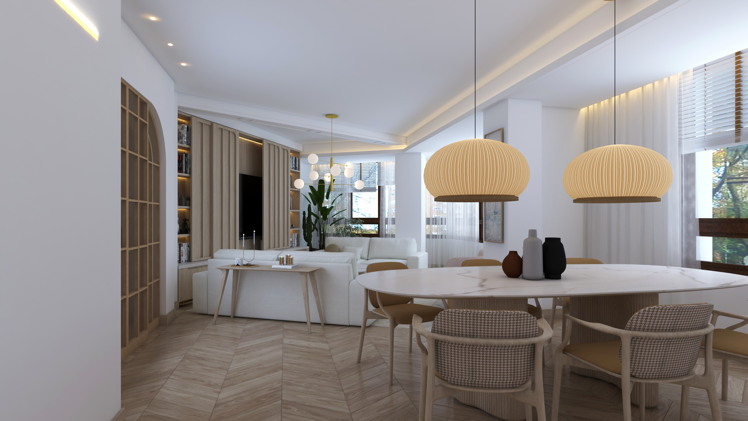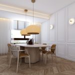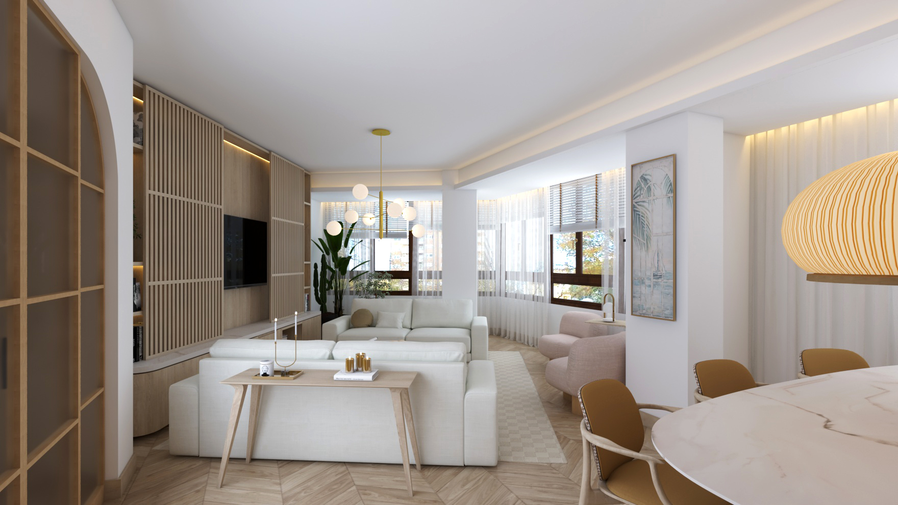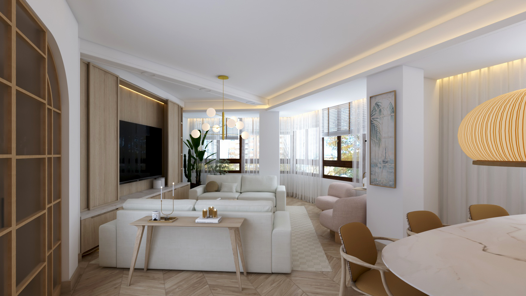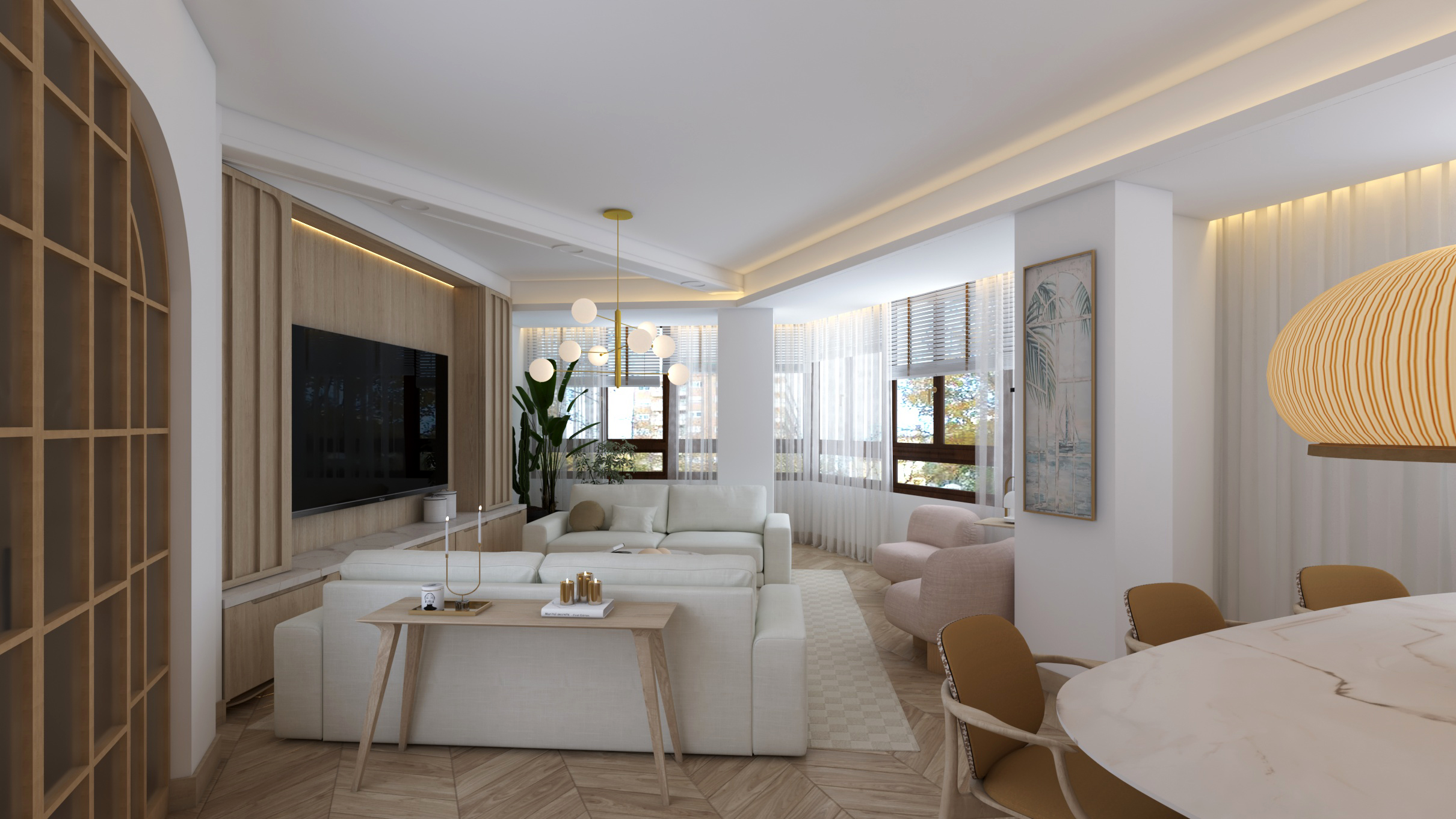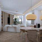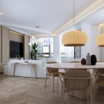Buscando siempre la máxima amplitud espacial y la mejor iluminación natural, se genera un único espacio común salón y comedor. Finalmente, mantenemos una sintonía de colores y materiales a lo largo de toda la vivienda.