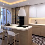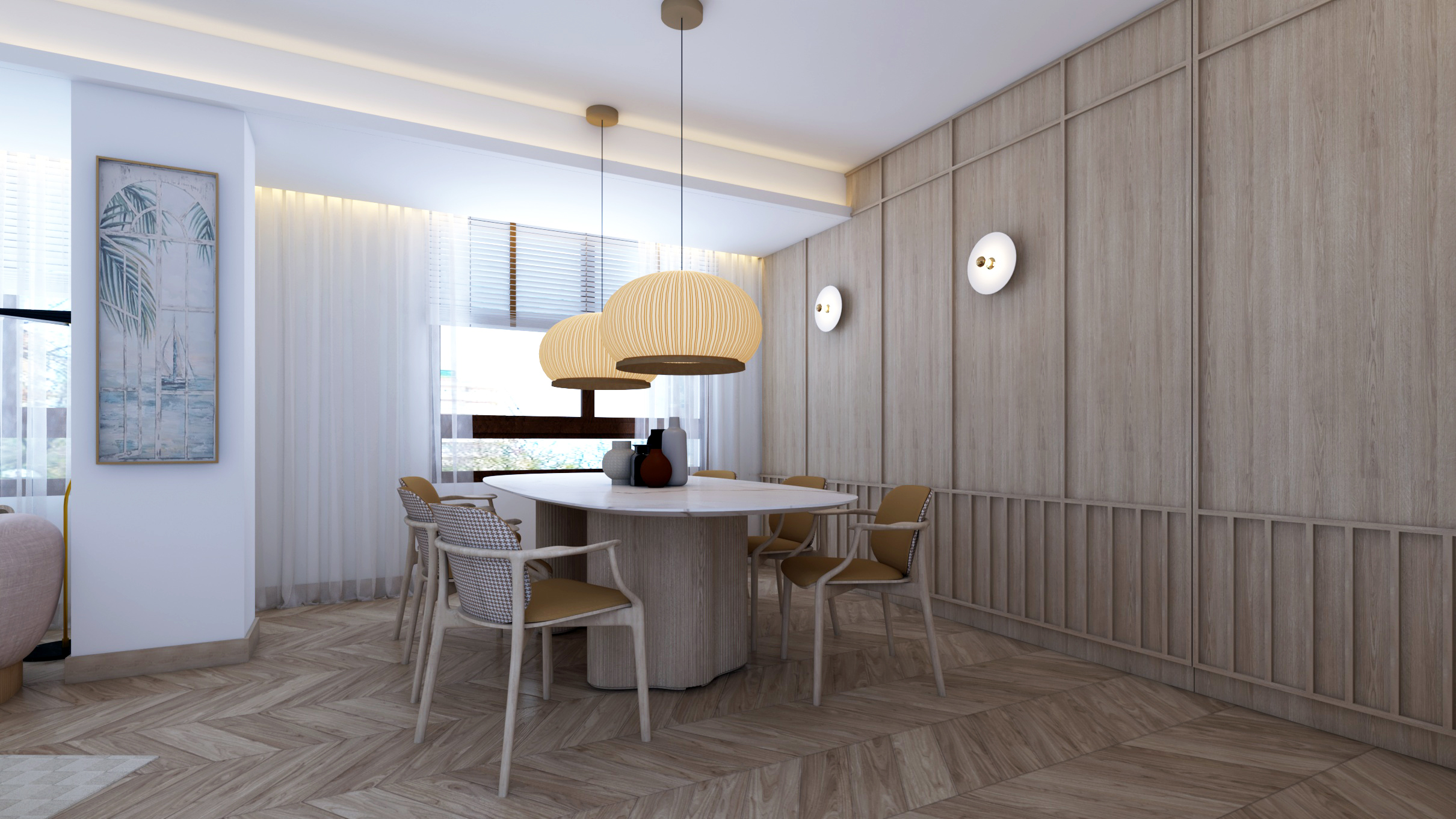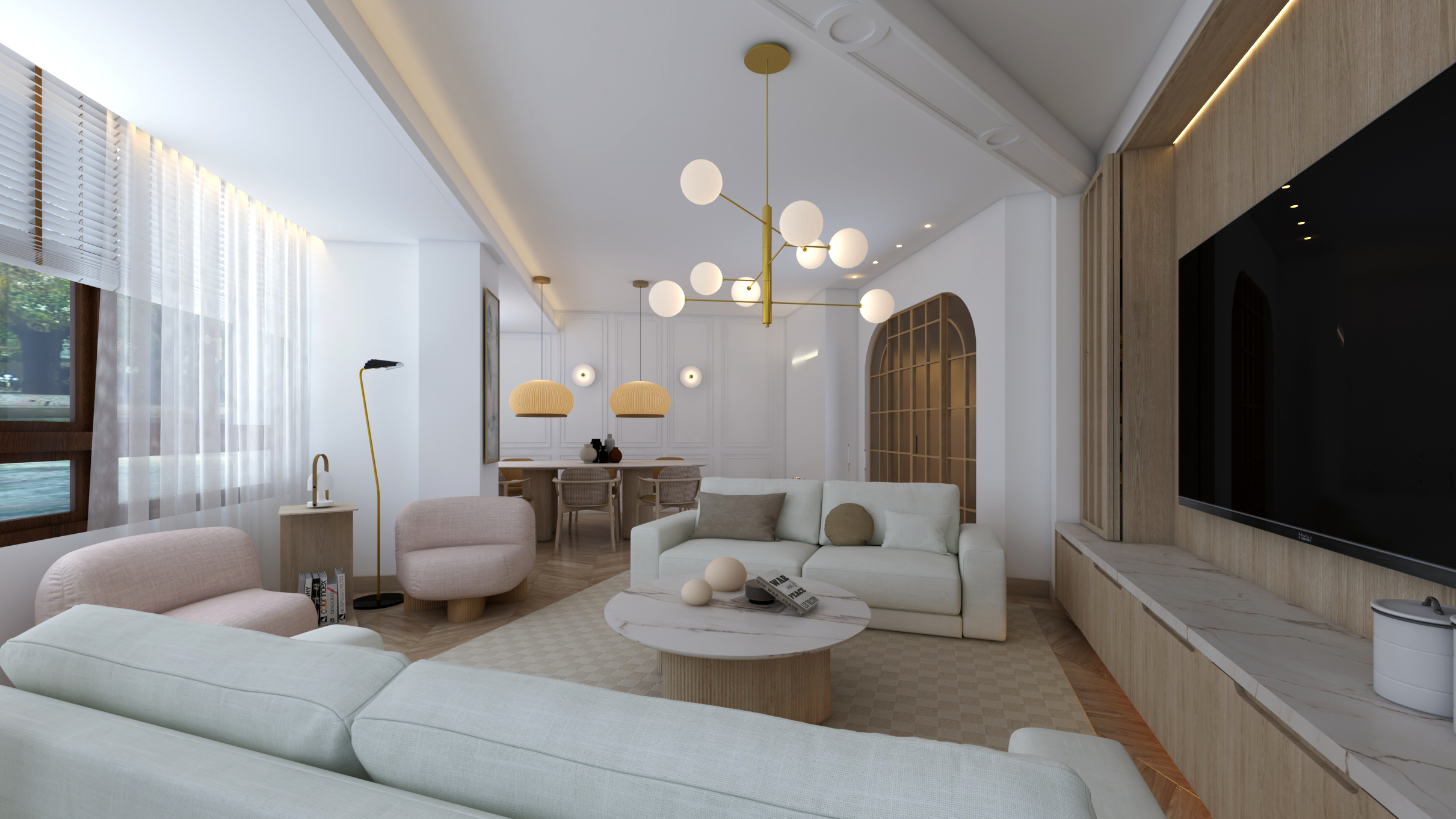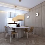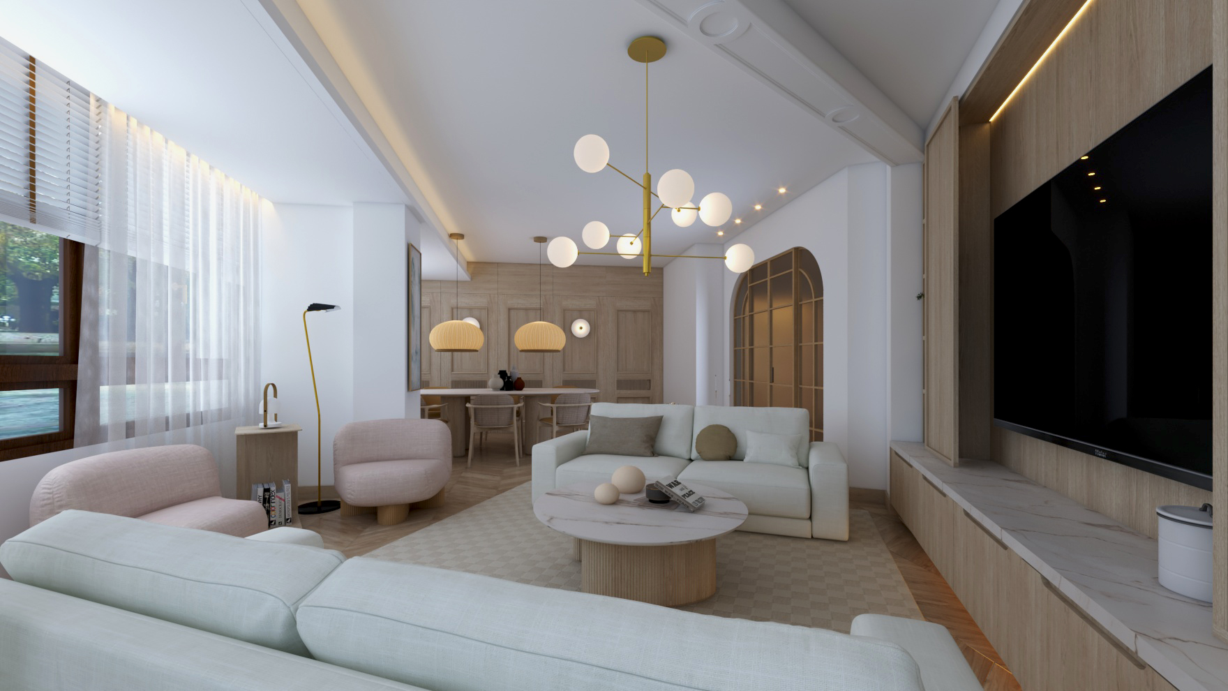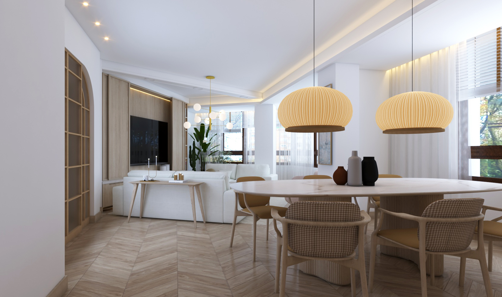 Buscando siempre la máxima amplitud espacial y la mejor iluminación natural, se genera un único espacio común salón y comedor. Finalmente, mantenemos una sintonía de colores y materiales a lo largo de toda la vivienda.