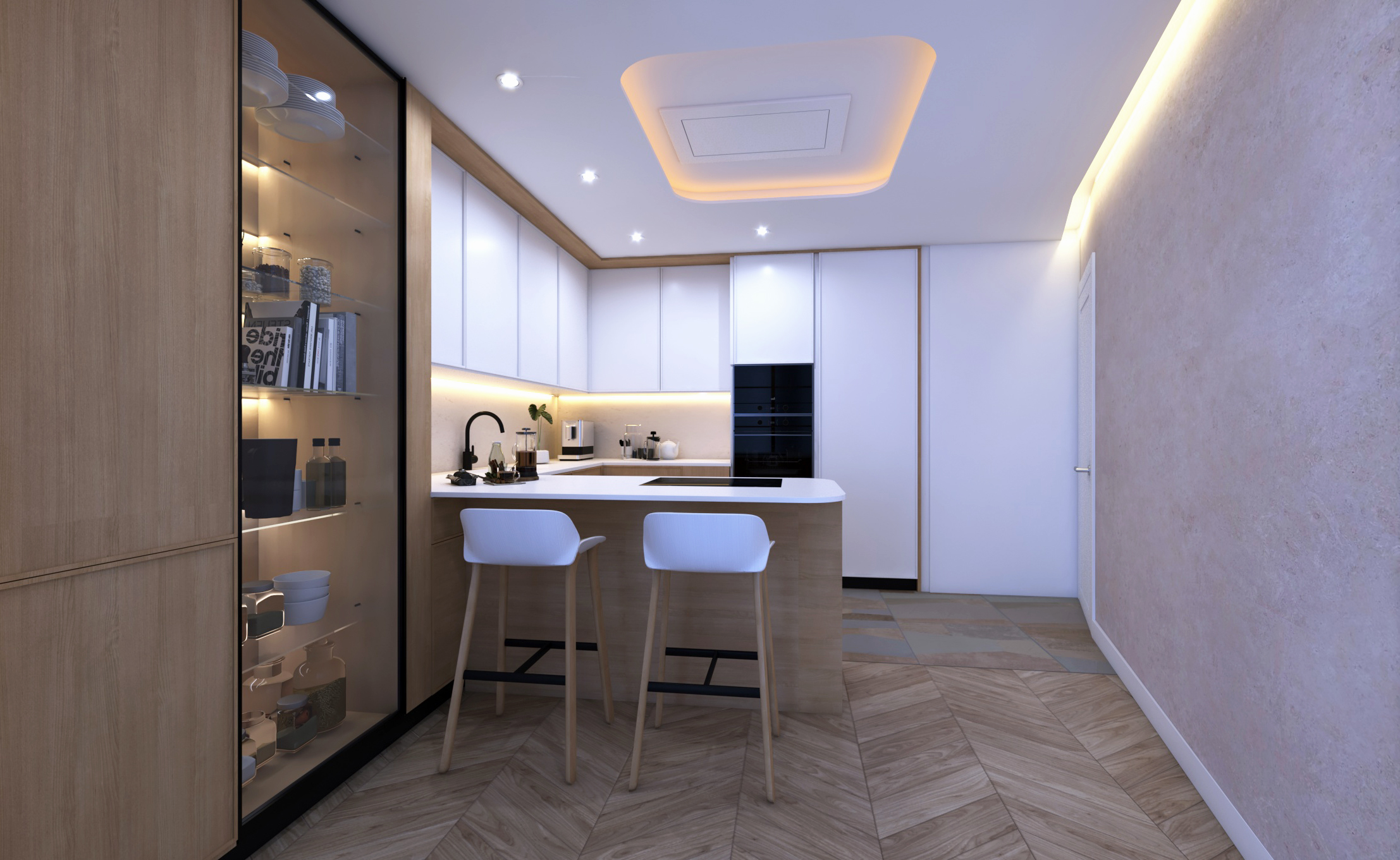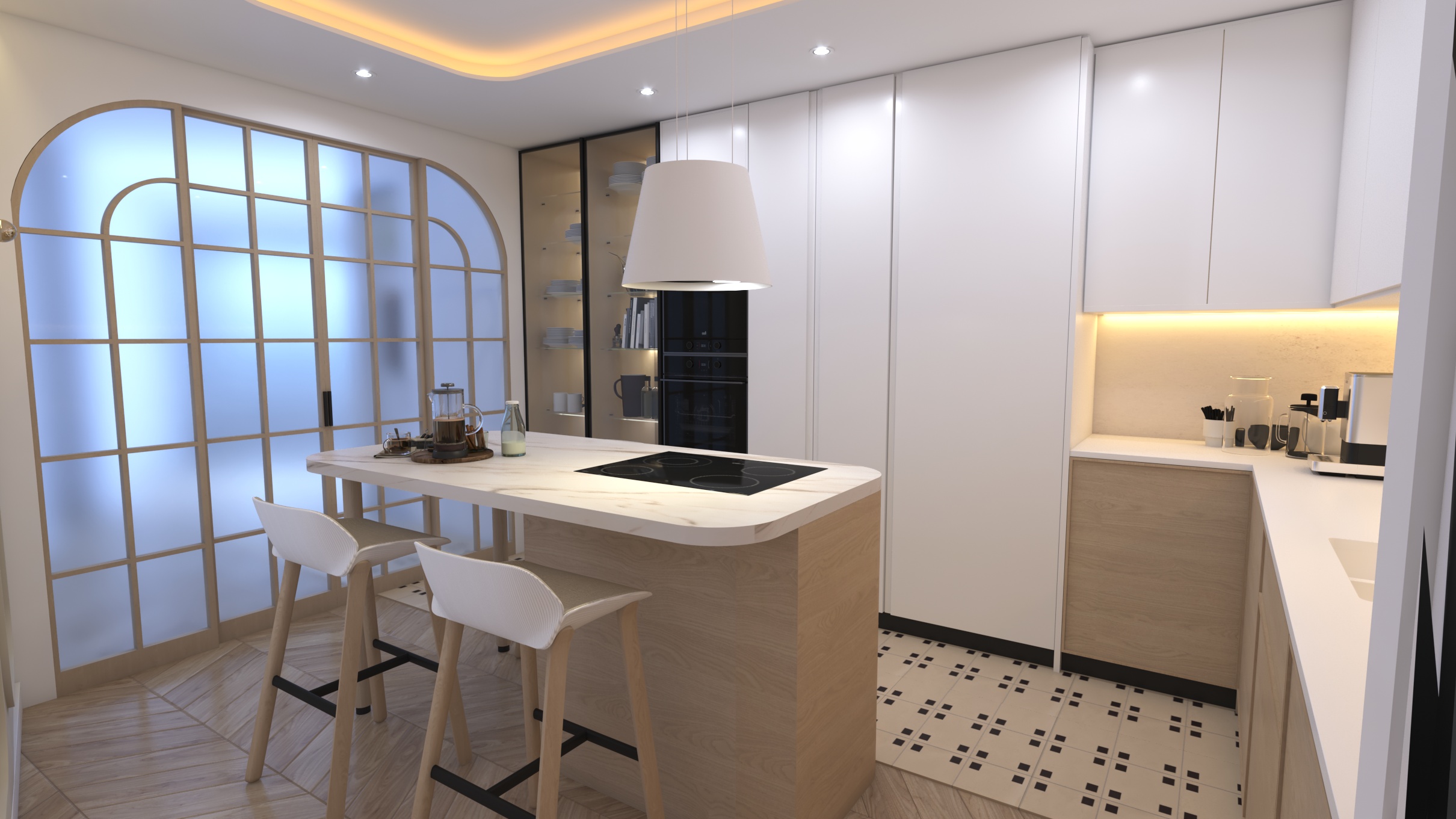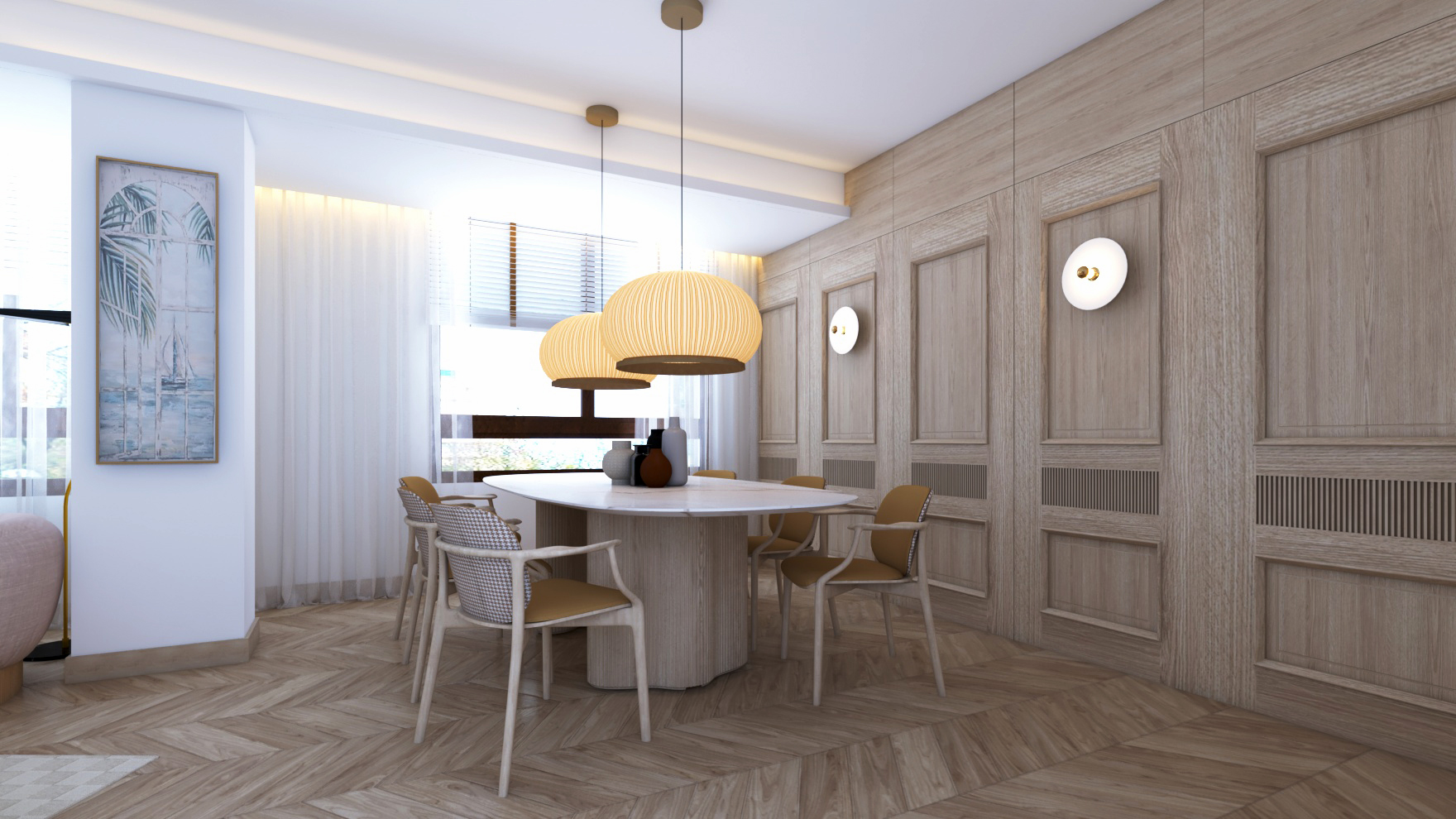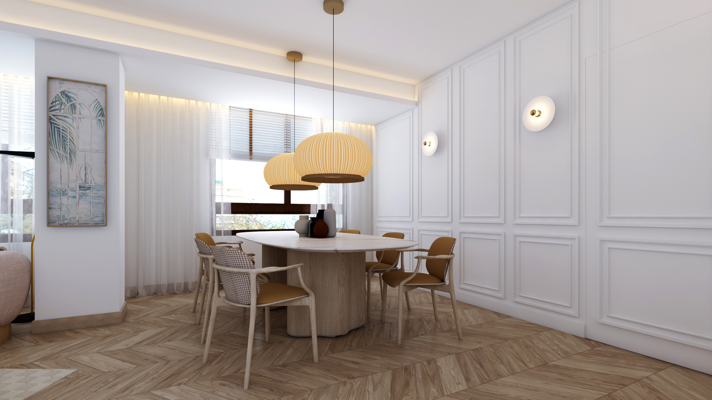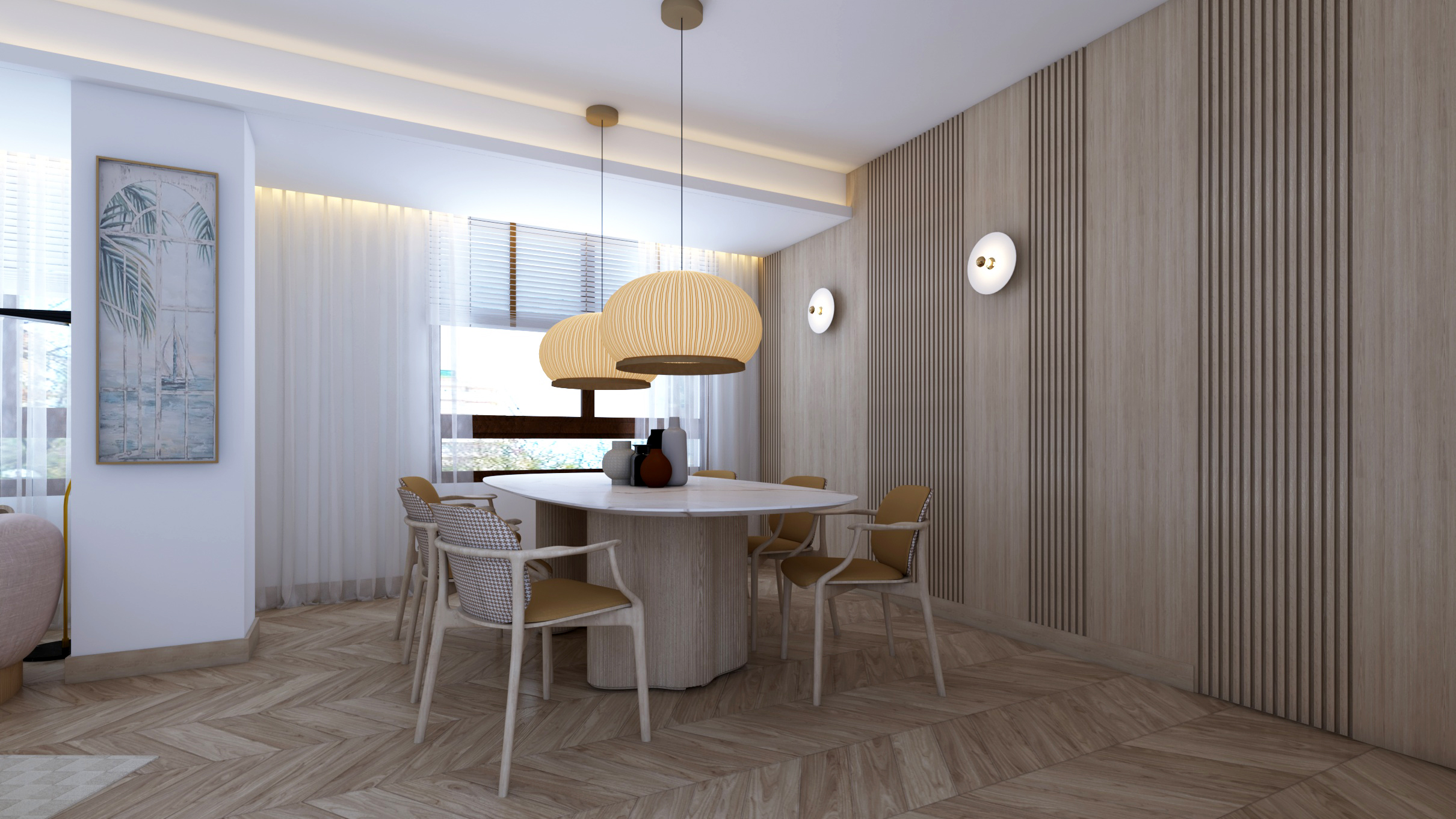 Buscando siempre la máxima amplitud espacial y la mejor iluminación natural, se genera un único espacio común salón y comedor. Finalmente, mantenemos una sintonía de colores y materiales a lo largo de toda la vivienda.